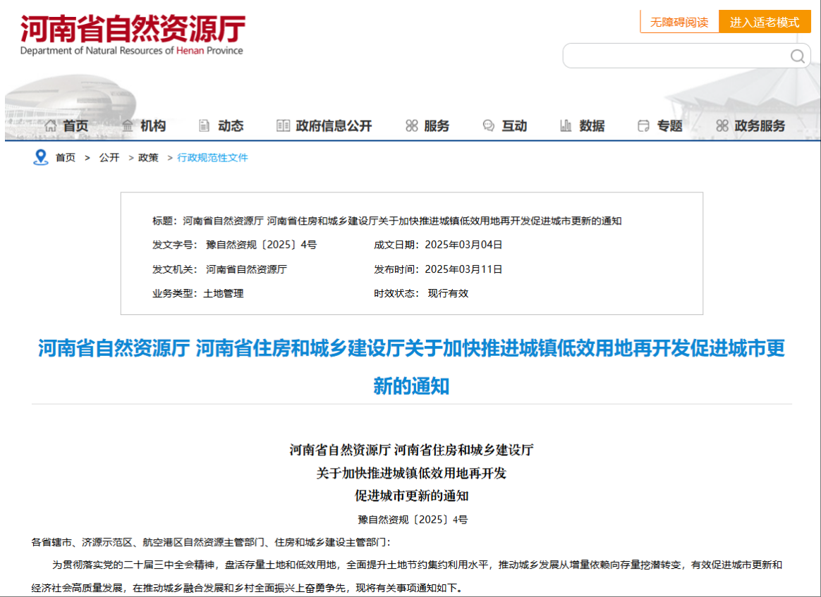 为推动城镇低效用地再开发,促进城市更新,近日,河南省自然资源厅、河南省住房和城乡建设厅印发《关于加快推进城镇低效用地再开发促进城市更新的通知》(以下简称《通知》)。