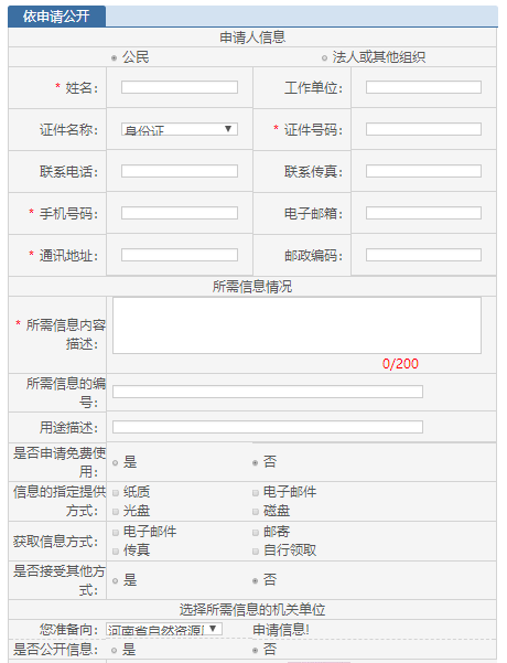 申请公开政府信息需要填写《河南省自然资源厅政府信息公开申请表》(以下简称《申请表》),申请表可在河南省自然资源厅行政服务中心大厅领取,也可在河南省自然资源厅门户网站()下载。